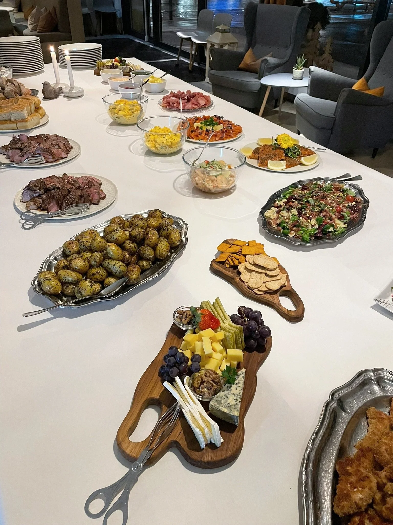 455kr per person Koldtbord KOLDTBORD Svinekam med heimelaga surkål, tomat og agurk Røykelaks med sitron og eggerøra Pannert Kylling Spekefat med fenalår og spekeskinka Varmrøykt pepperaure på salatseng I SKÅLER Salat, paprika, tomat, agurk, mais, potetsalat, dressing, rømme, brød og smør VALFRI DESSERT Legg til varmrett for 130kr per person VARMRETT Biff stroganoff med ris eller potetmos